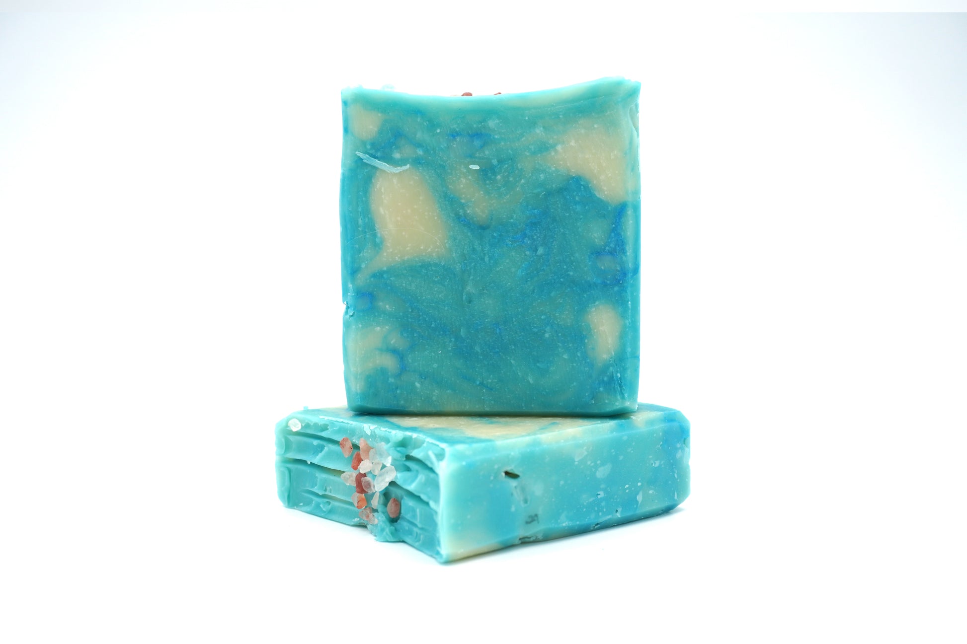 olive oil, coconut oil, tallow, palm oil, rice bran oil, castor oil, sodium hydroxide, sugar syrup, citric acid, Himalayan pink salt, blue mica. Cedarwood, sandalwood, vetiver, rose geranium, frankincense, clove leaf and bergamot.