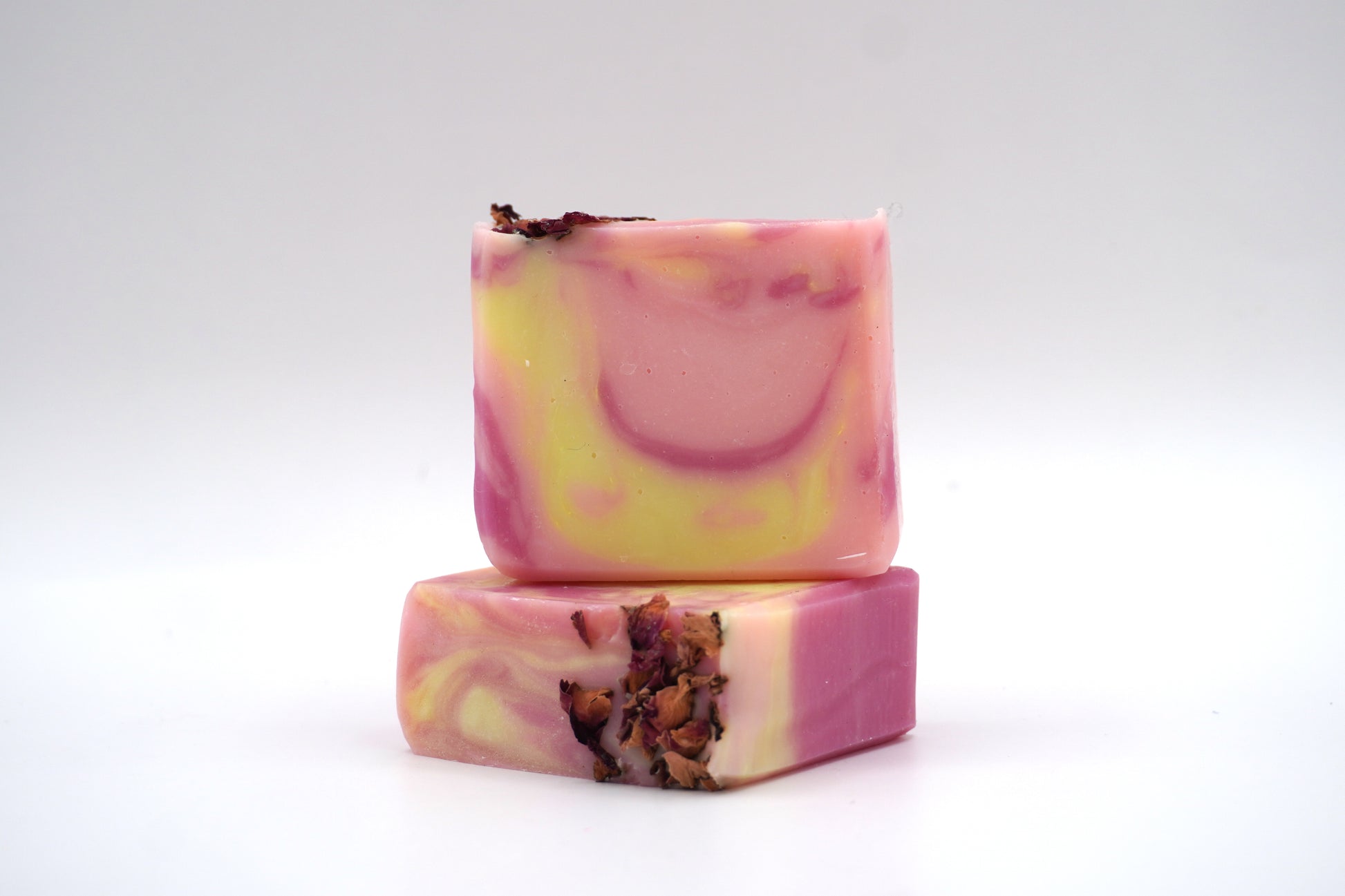 Meet this enchanting soap, swirling in soft pinks, reds, and yellows for a truly beautiful presentation. Topped with delicate rose petals, each bar brings a touch of botanical elegance and charm to your bath. Luxurious and gentle, this soap transforms an everyday routine into a moment of floral indulgence.